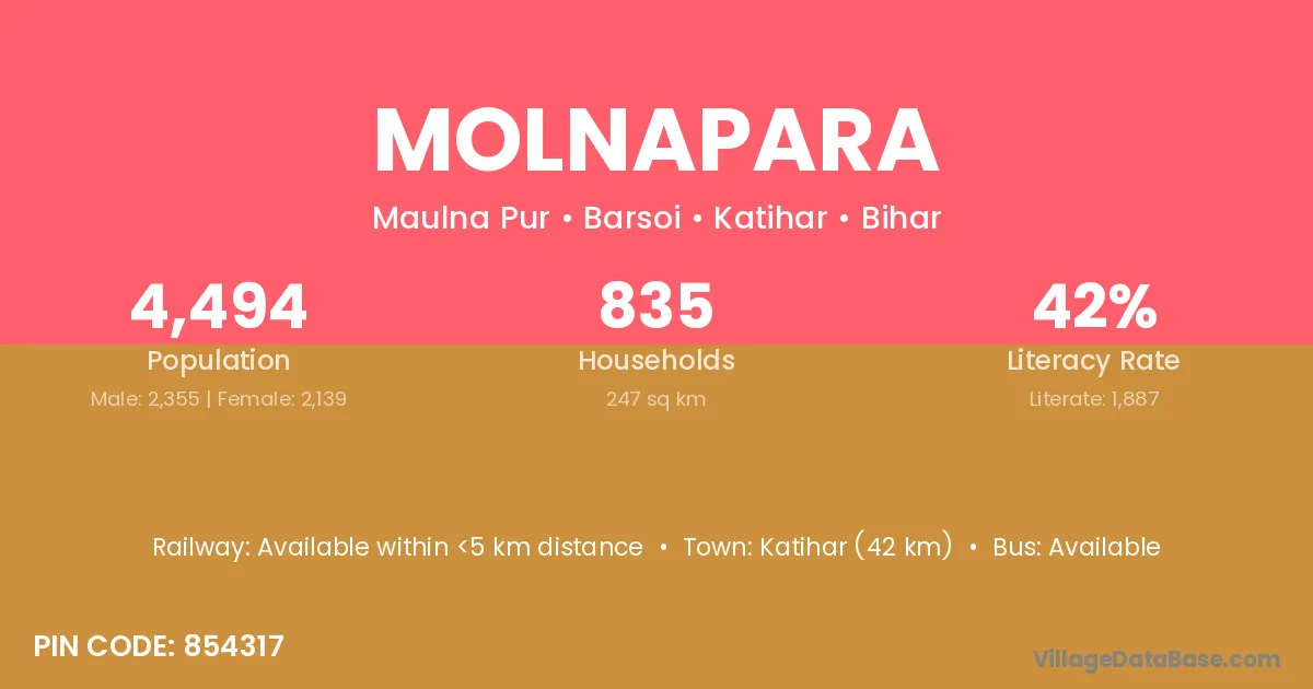 Katihar (42 km) is the nearest town to Molnapara village for major economic activities and is located approximately 42 km away.
