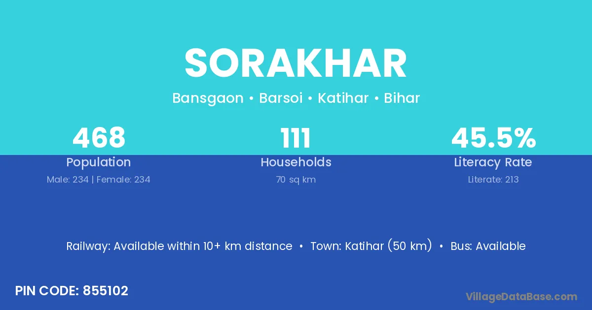 Katihar (50 km) is the nearest town to Sorakhar village for major economic activities and is located approximately 50 km away.