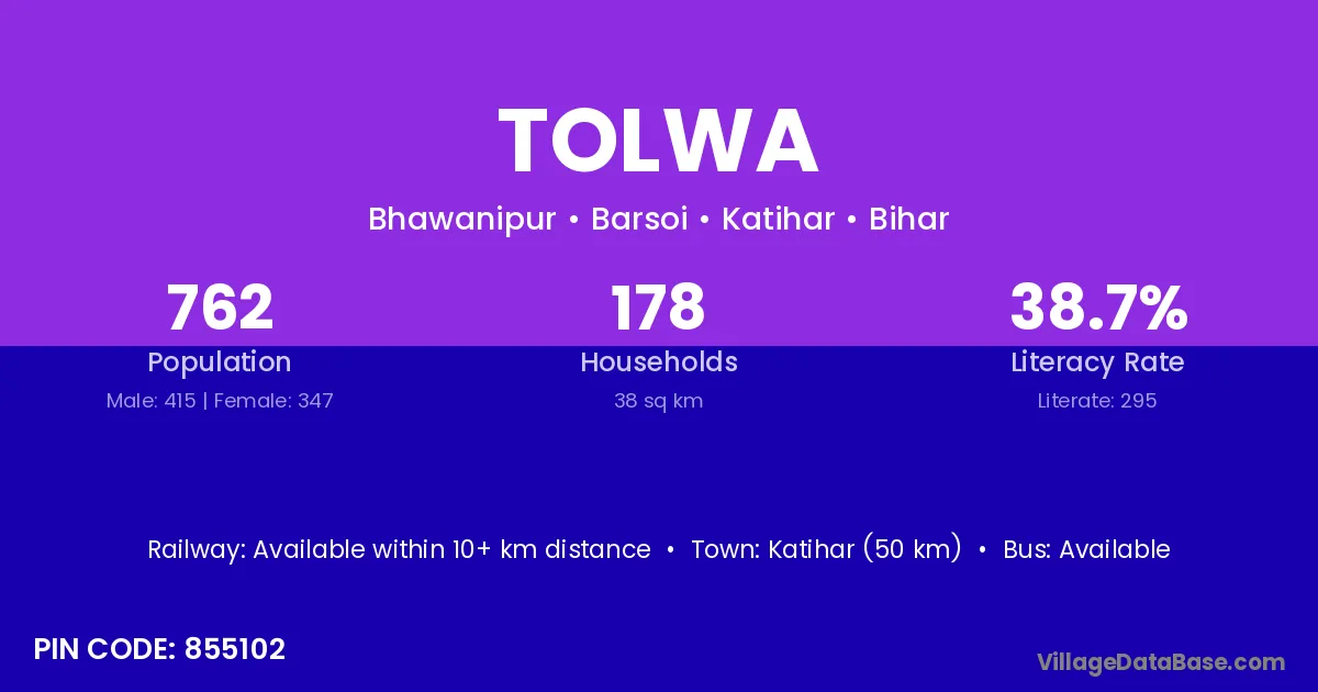 Katihar (50 km) is the nearest town to Tolwa village for major economic activities and is located approximately 50 km away.