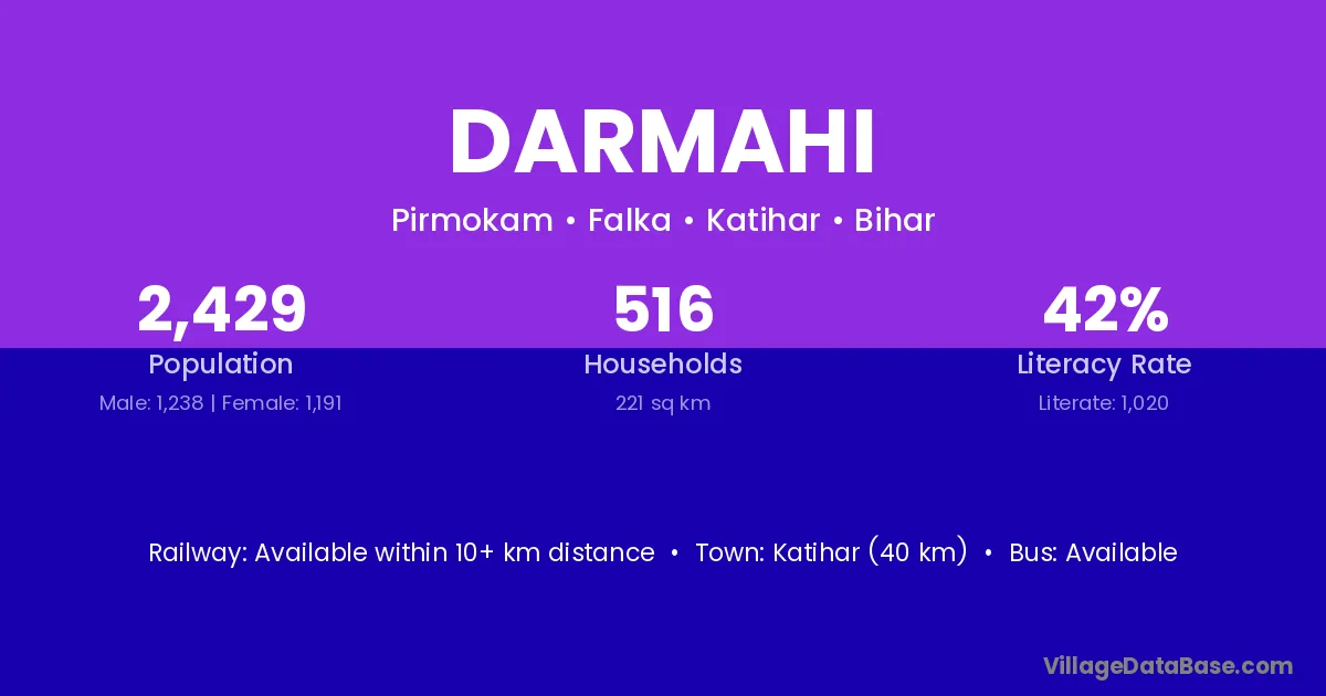 Katihar (40 km) is the nearest town to Darmahi village for major economic activities and is located approximately 40 km away.