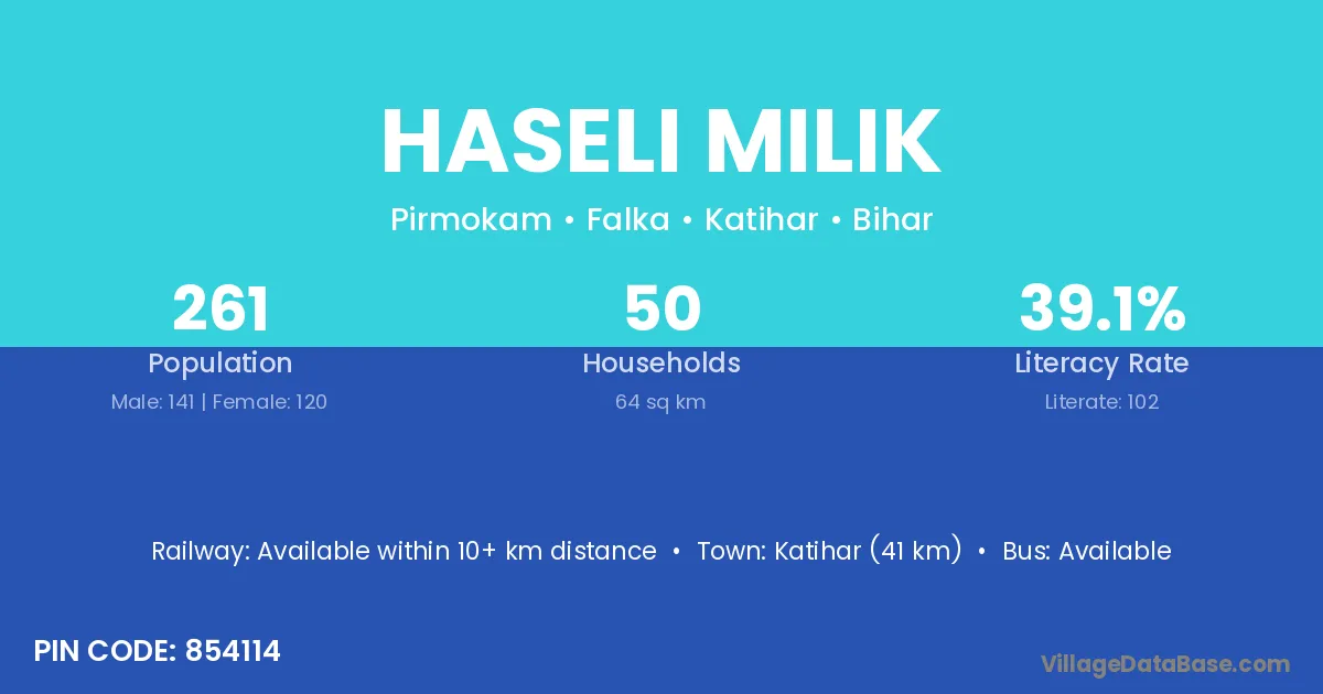 Katihar (41 km) is the nearest town to Haseli Milik village for major economic activities and is located approximately 41 km away.