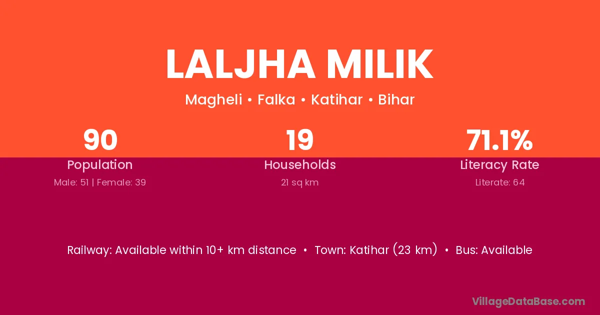 Katihar (23 km) is the nearest town to Laljha Milik village for major economic activities and is located approximately 23 km away.