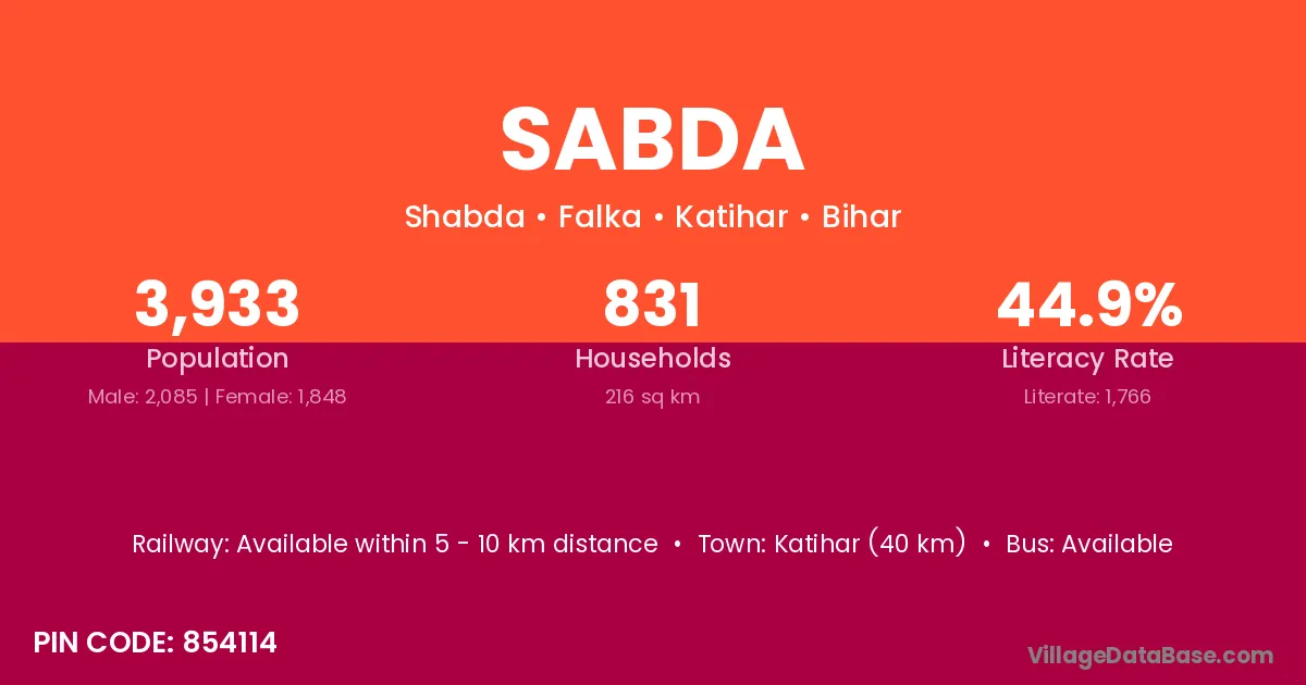Katihar (40 km) is the nearest town to Sabda village for major economic activities and is located approximately 40 km away.