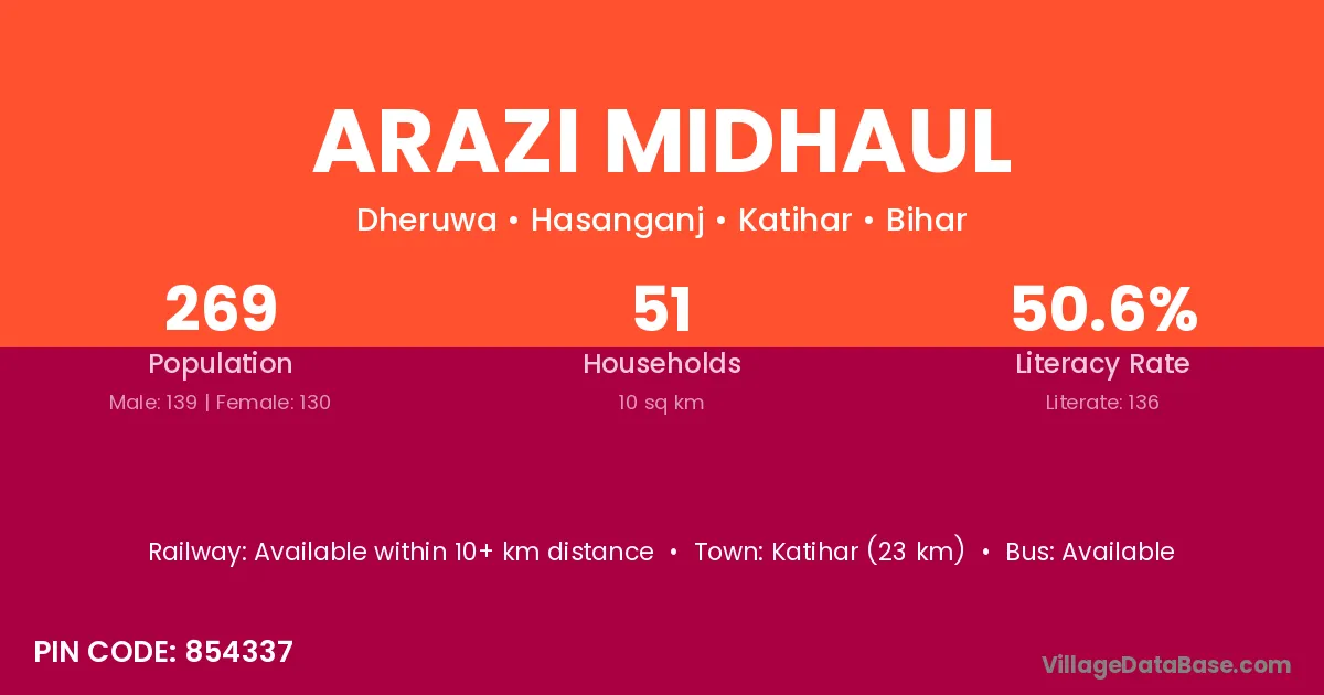 Katihar (23 km) is the nearest town to Arazi Midhaul village for major economic activities and is located approximately 23 km away.