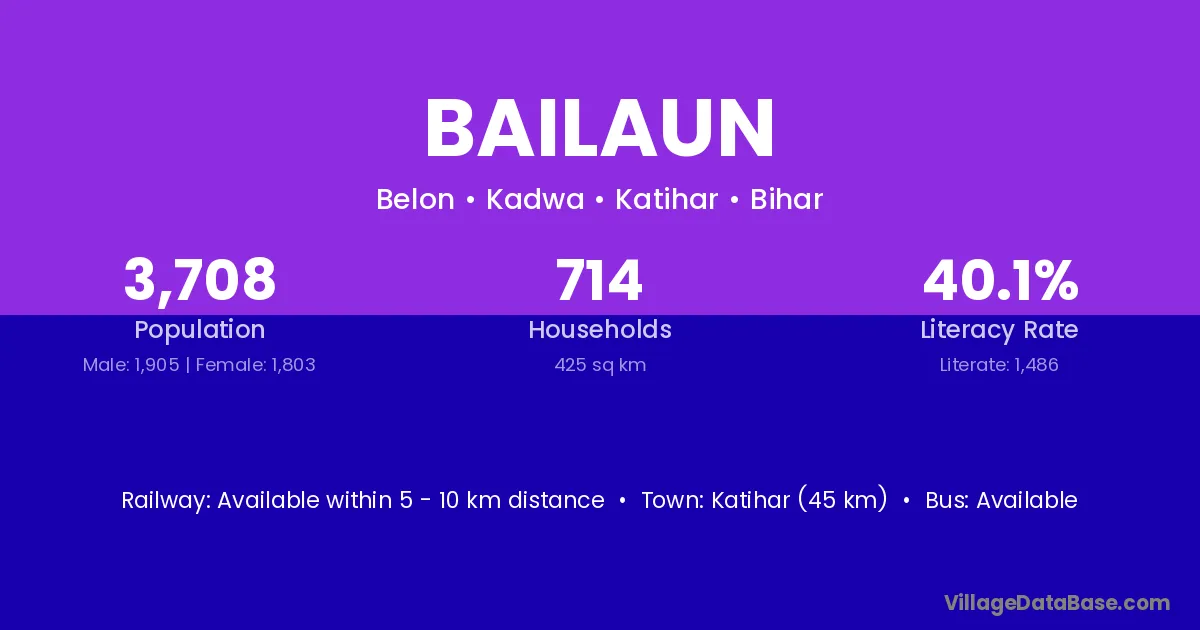 Katihar (45 km) is the nearest town to Bailaun village for major economic activities and is located approximately 45 km away.