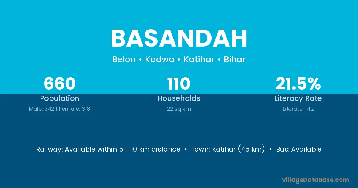 Katihar (45 km) is the nearest town to Basandah village for major economic activities and is located approximately 45 km away.