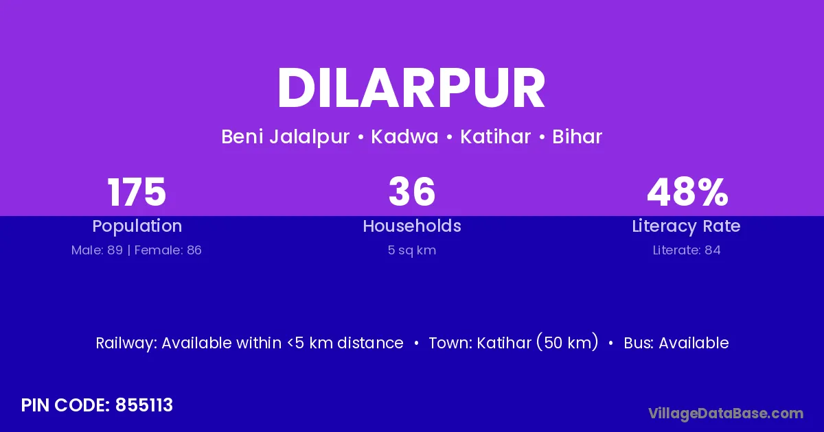 Katihar (50 km) is the nearest town to Dilarpur village for major economic activities and is located approximately 50 km away.