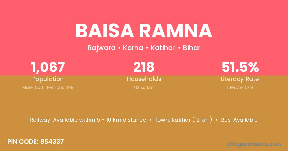 Katihar (12 km) is the nearest town to Baisa Ramna village for major economic activities and is located approximately 12 km away.