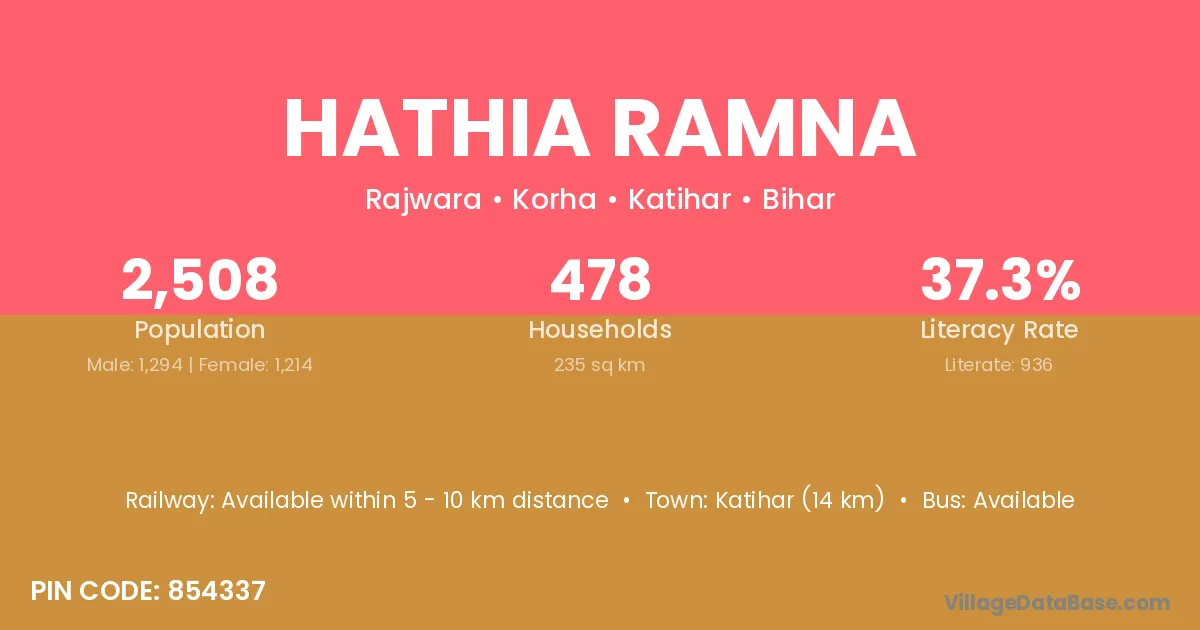 Katihar (14 km) is the nearest town to Hathia Ramna village for major economic activities and is located approximately 14 km away.