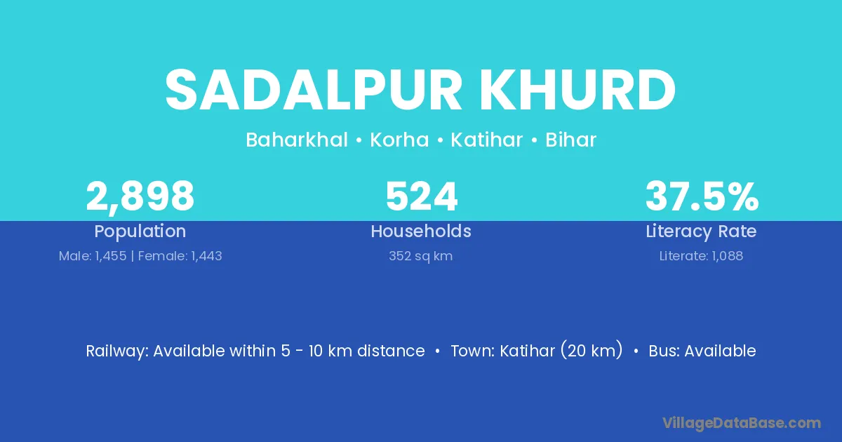Katihar (20 km) is the nearest town to Sadalpur Khurd village for major economic activities and is located approximately 20 km away.