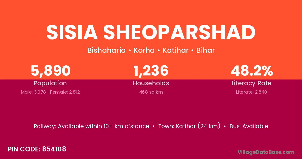 Katihar (24 km) is the nearest town to Sisia Sheoparshad village for major economic activities and is located approximately 24 km away.