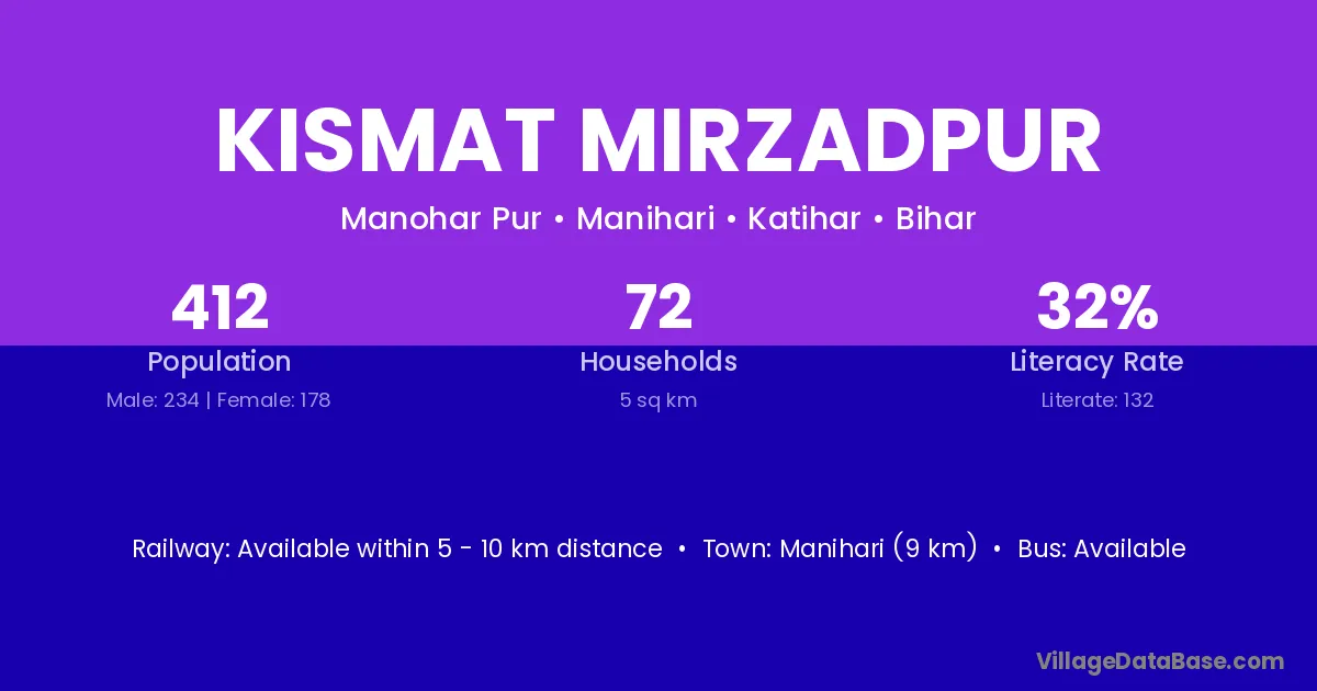 Manihari (9 km) is the nearest town to Kismat Mirzadpur village for major economic activities and is located approximately 9 km away.
