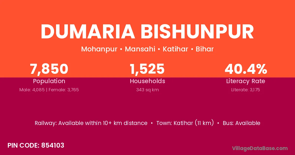 Katihar (11 km) is the nearest town to Dumaria Bishunpur village for major economic activities and is located approximately 11 km away.