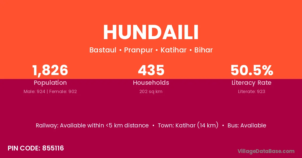 Katihar (14 km) is the nearest town to Hundaili village for major economic activities and is located approximately 14 km away.