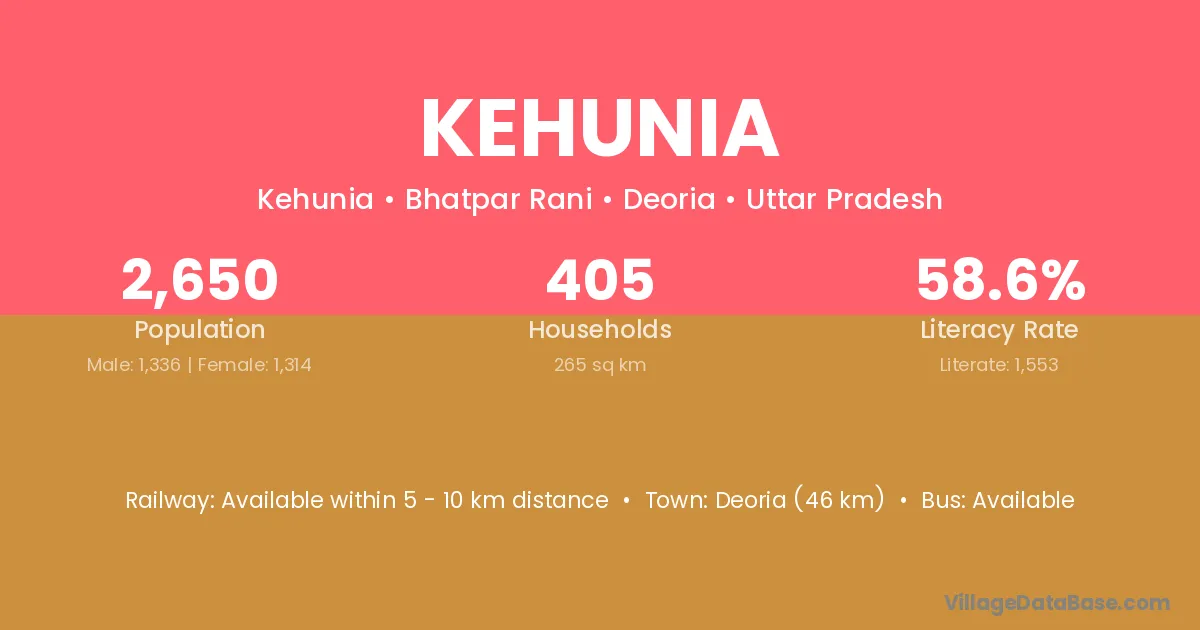 The literacy rate of Kehunia village is 43.88%. Male literacy stands at 50.42% and female literacy at 36.95%.