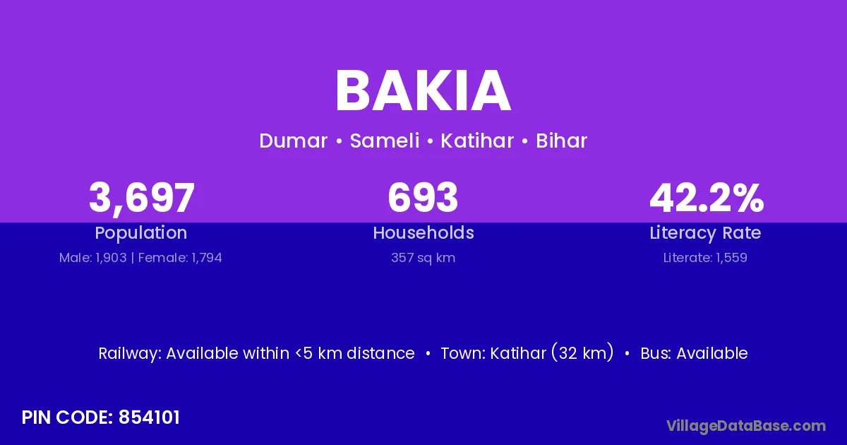 Katihar (32 km) is the nearest town to Bakia village for major economic activities and is located approximately 32 km away.