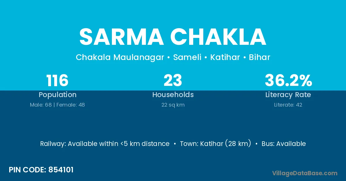 Katihar (28 km) is the nearest town to Sarma Chakla village for major economic activities and is located approximately 28 km away.