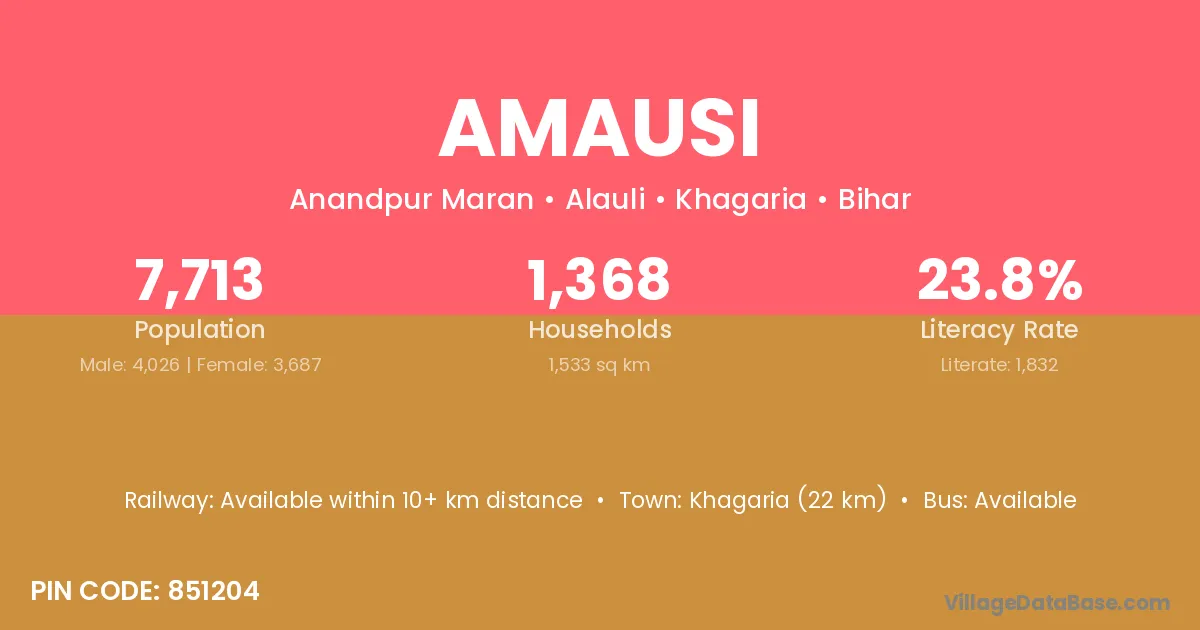 Khagaria (22 km) is the nearest town to Amausi village for major economic activities and is located approximately 22 km away.