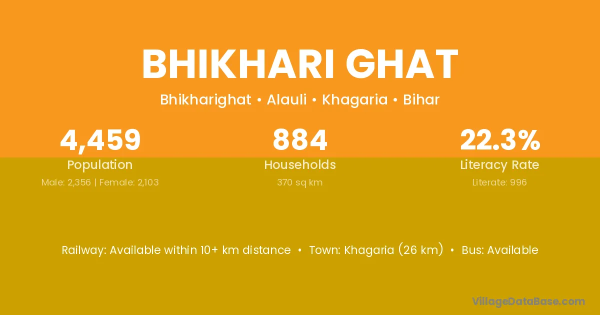 Khagaria (26 km) is the nearest town to Bhikhari Ghat village for major economic activities and is located approximately 26 km away.