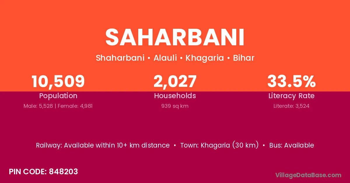 Khagaria (30 km) is the nearest town to Saharbani village for major economic activities and is located approximately 30 km away.