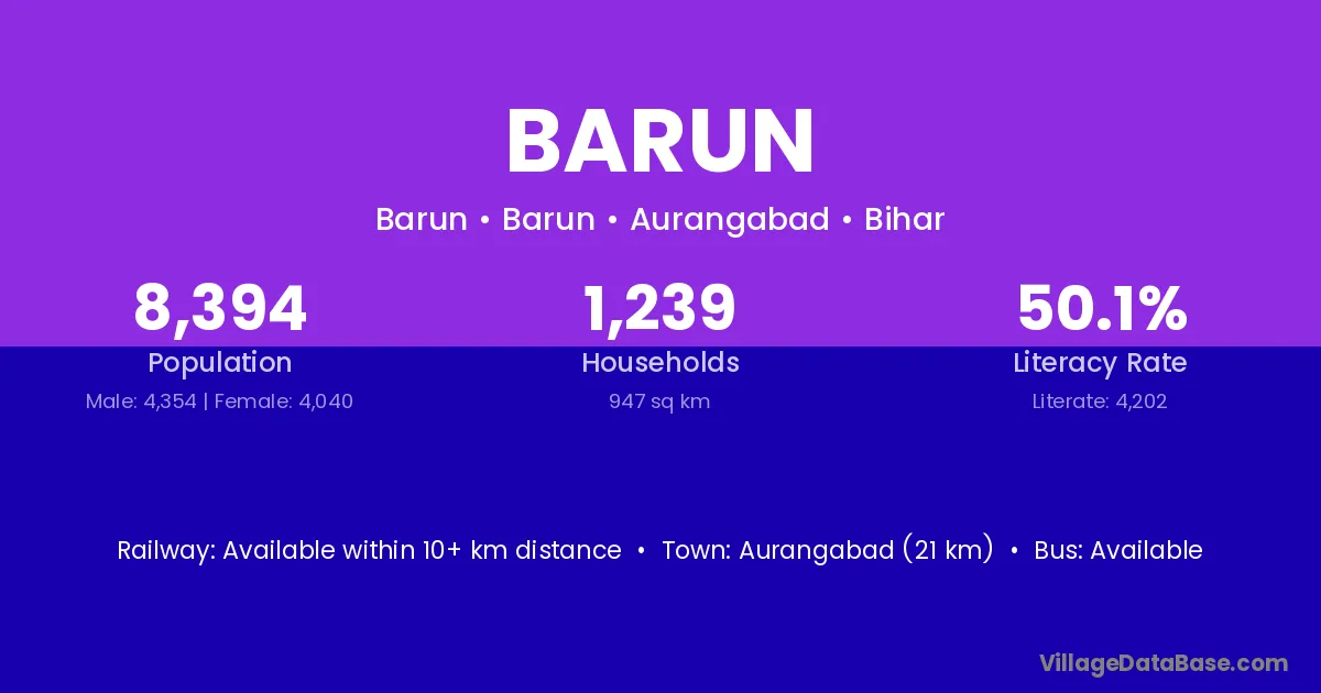 The literacy rate of Barun village is 31.82%. Male literacy stands at 41.46% and female literacy at 20.89%.