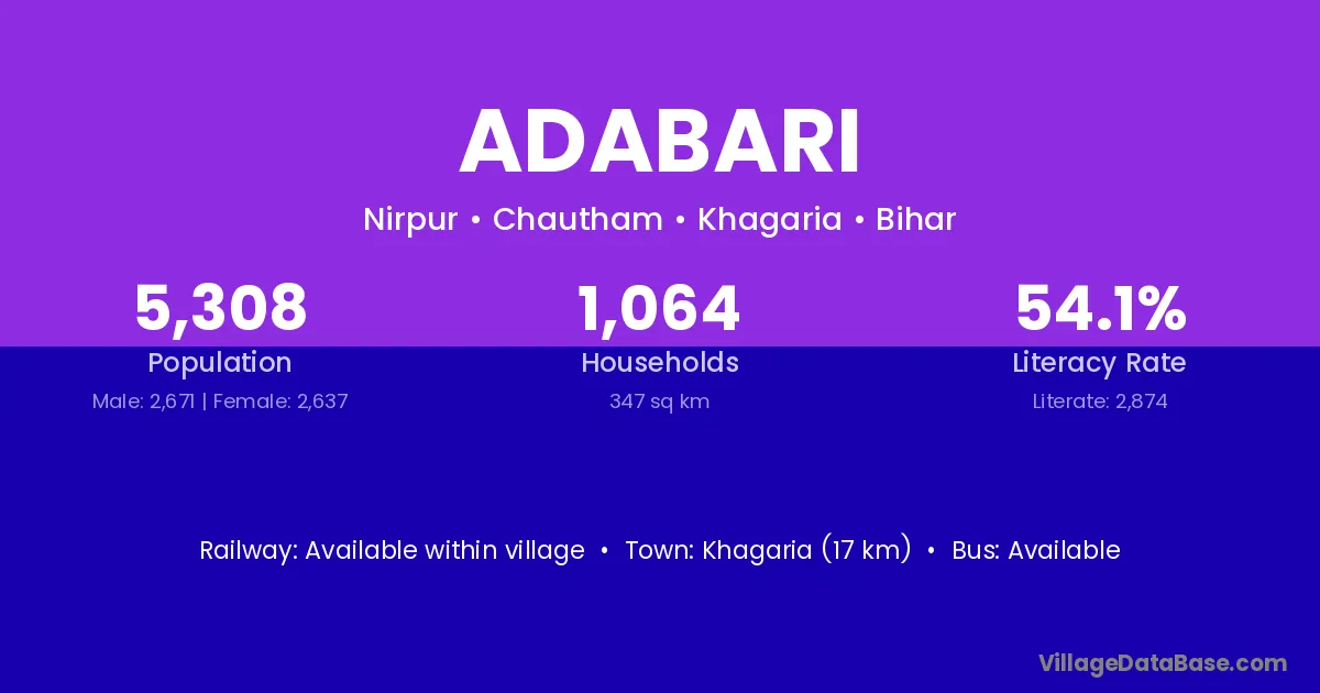 Khagaria (17 km) is the nearest town to Adabari village for major economic activities and is located approximately 17 km away.