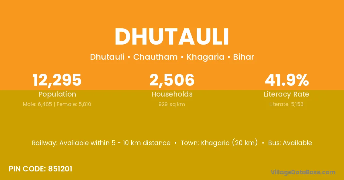 Khagaria (20 km) is the nearest town to Dhutauli village for major economic activities and is located approximately 20 km away.