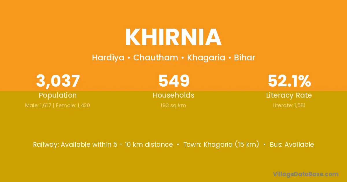 Khagaria (15 km) is the nearest town to Khirnia village for major economic activities and is located approximately 15 km away.