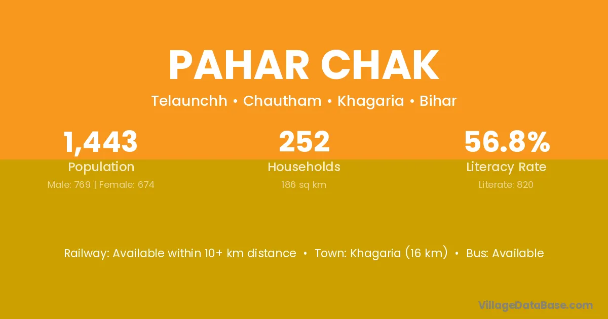 Khagaria (16 km) is the nearest town to Pahar Chak village for major economic activities and is located approximately 16 km away.