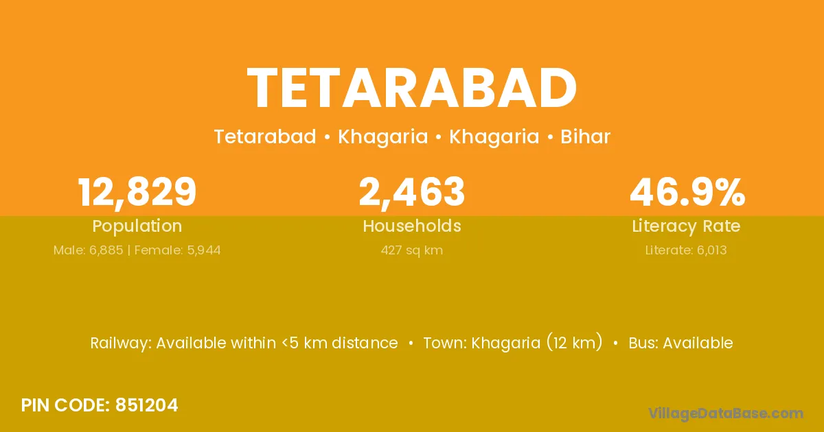 Khagaria (12 km) is the nearest town to Tetarabad village for major economic activities and is located approximately 12 km away.