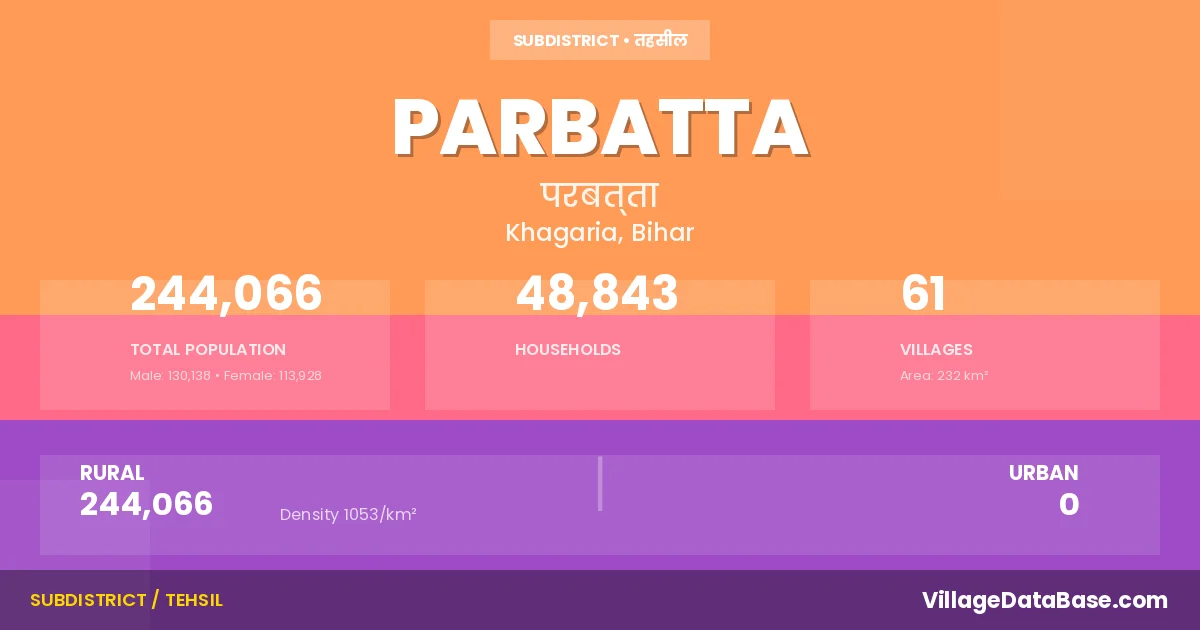 According to the 2011 census The total area of Parbatta Subdivision is 232 km², with a population of 244066 people. The population density is 1,053 inhabitants per square kilometre, and there are approximately 48843 houses in the sub district.