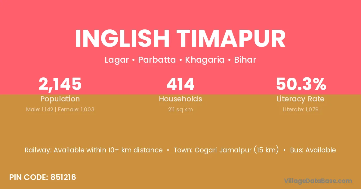 Gogari Jamalpur (15 km) is the nearest town to Inglish Timapur village for major economic activities and is located approximately 15 km away.
