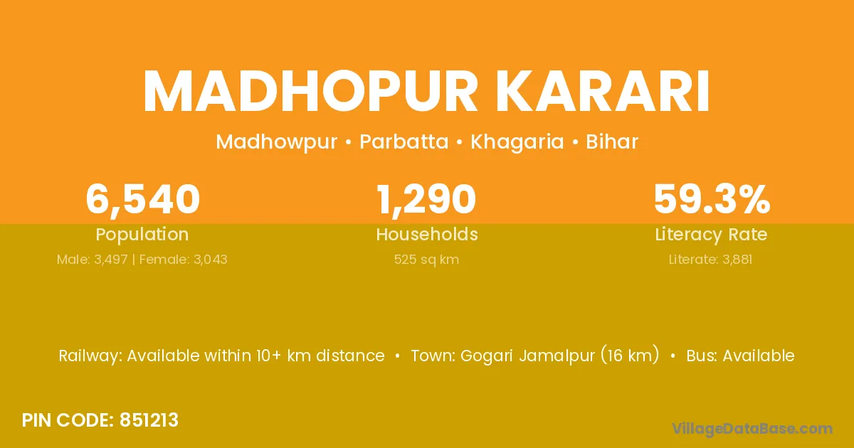 Gogari Jamalpur (16 km) is the nearest town to Madhopur Karari village for major economic activities and is located approximately 16 km away.