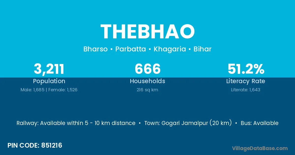Thebhao village has a total population of 3,211 people, of which 1,685 are males and 1,526 are females.