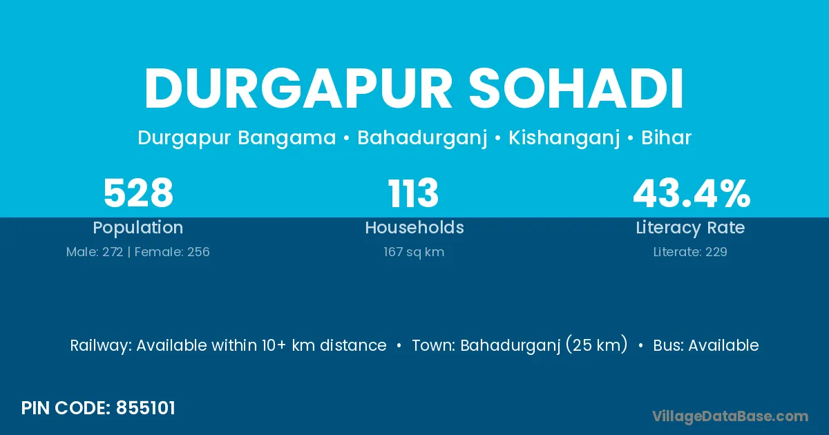 Bahadurganj (25 km) is the nearest town to Durgapur Sohadi village for major economic activities and is located approximately 25 km away.