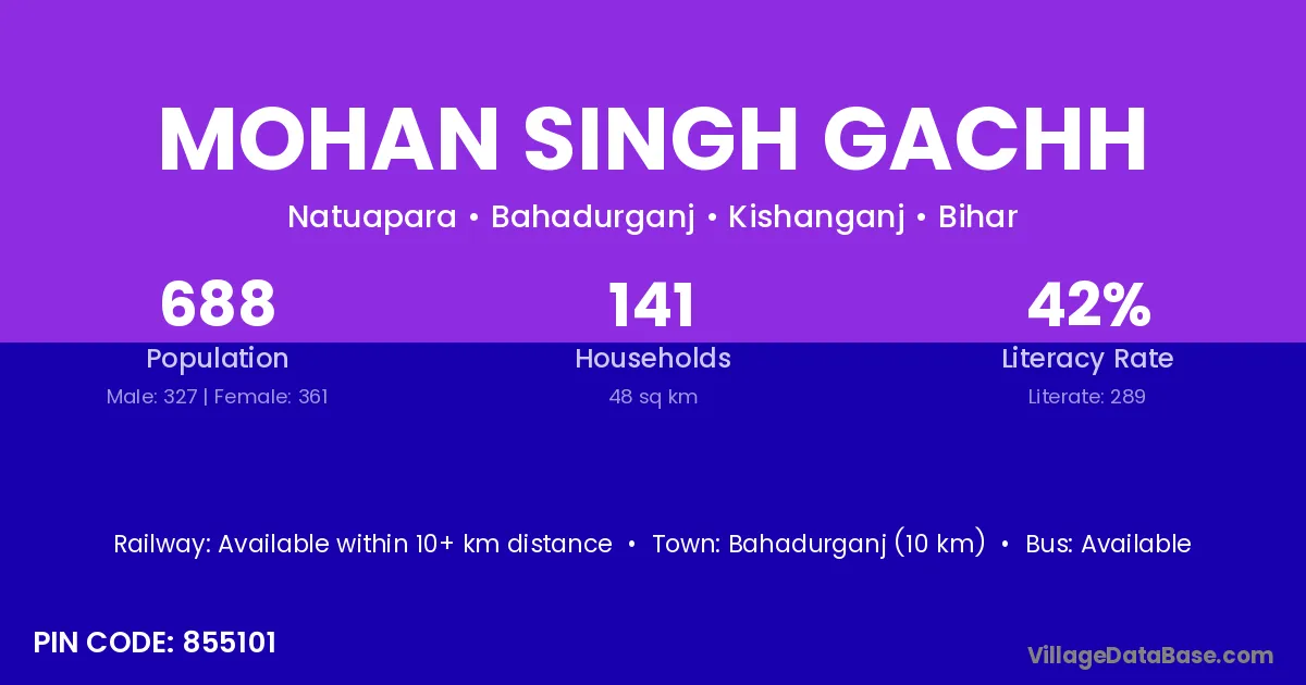 Bahadurganj (10 km) is the nearest town to Mohan Singh Gachh village for major economic activities and is located approximately 10 km away.