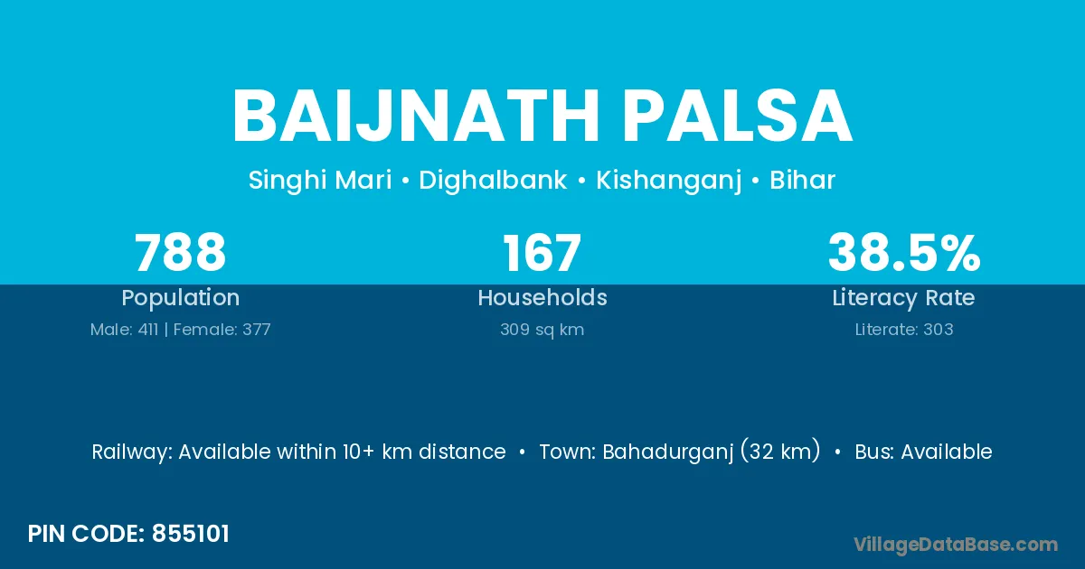 Bahadurganj (32 km) is the nearest town to Baijnath Palsa village for major economic activities and is located approximately 32 km away.