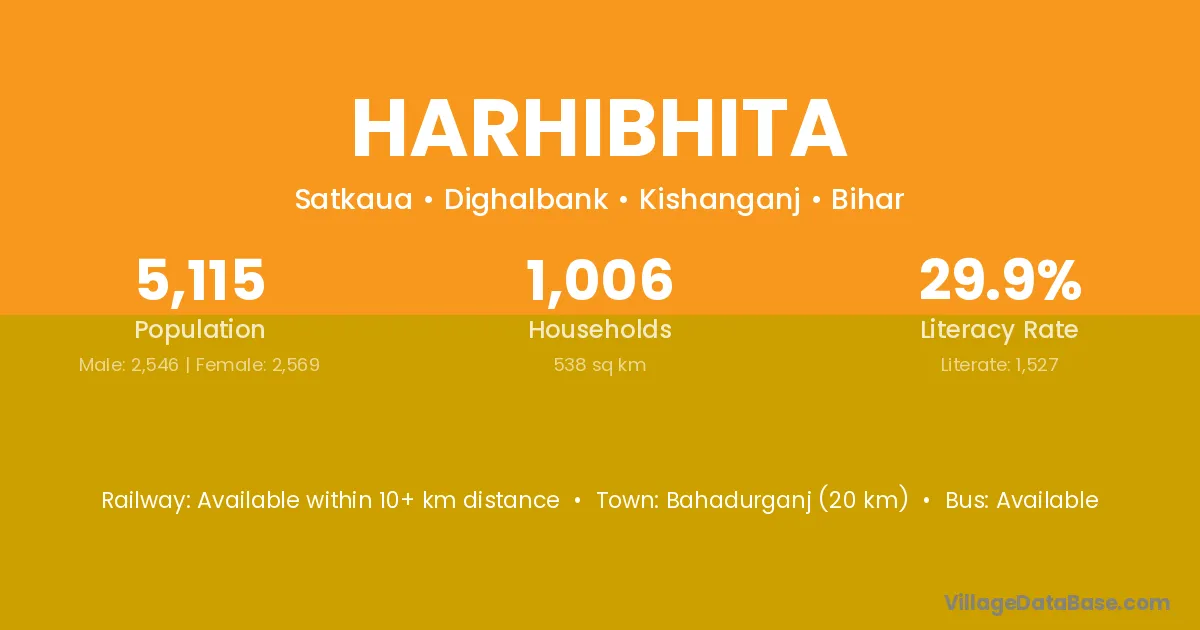 Bahadurganj (20 km) is the nearest town to Harhibhita village for major economic activities and is located approximately 20 km away.