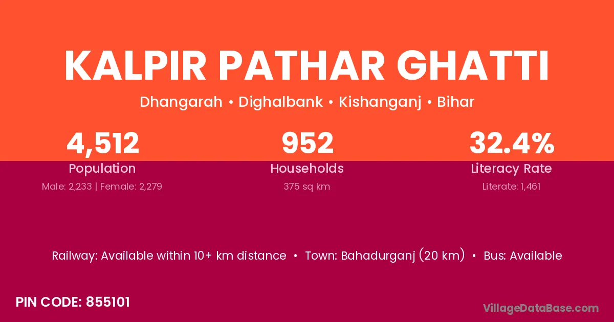 Kalpir Pathar Ghatti village has a total population of 4,512 people, of which 2,233 are males and 2,279 are females.