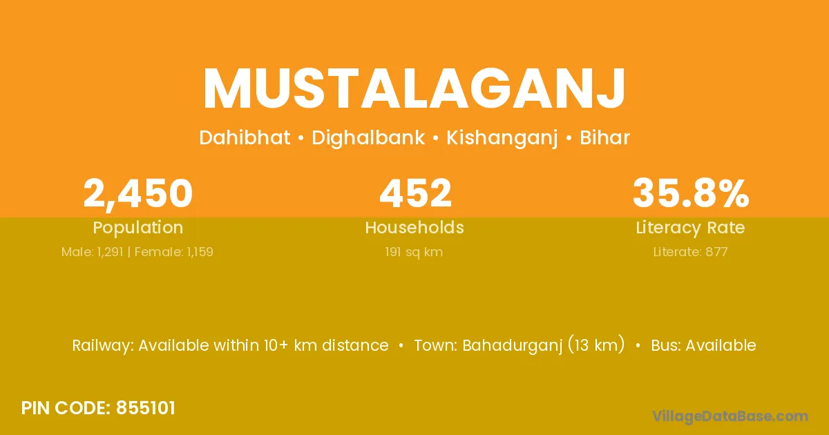 Bahadurganj (13 km) is the nearest town to Mustalaganj village for major economic activities and is located approximately 13 km away.