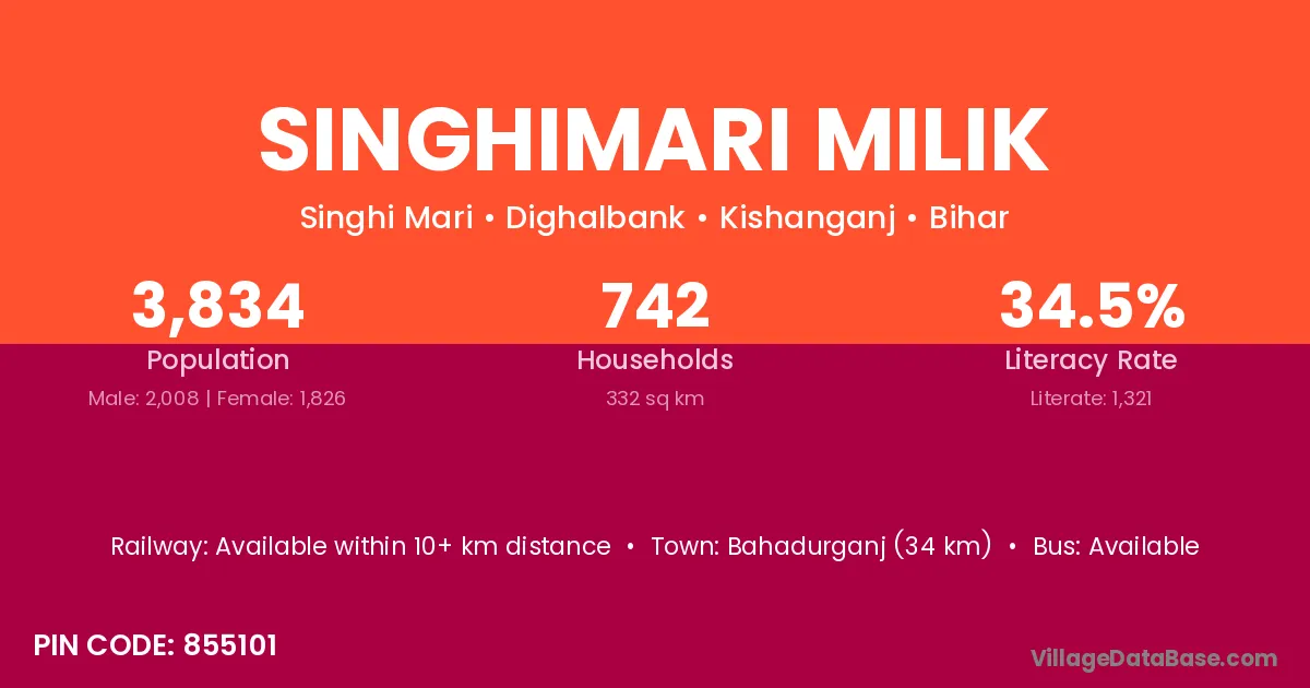 Bahadurganj (34 km) is the nearest town to Singhimari Milik village for major economic activities and is located approximately 34 km away.