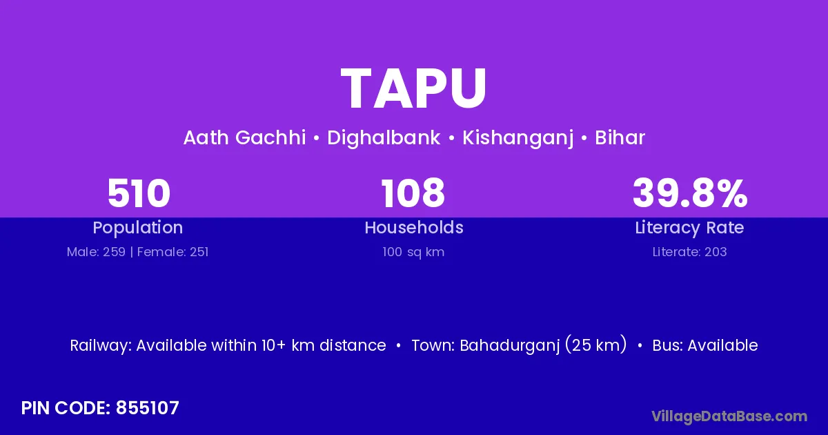 Tapu village has a total population of 510 people, of which 259 are males and 251 are females.