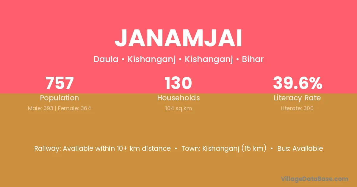 Kishanganj (15 km) is the nearest town to Janamjai village for major economic activities and is located approximately 15 km away.