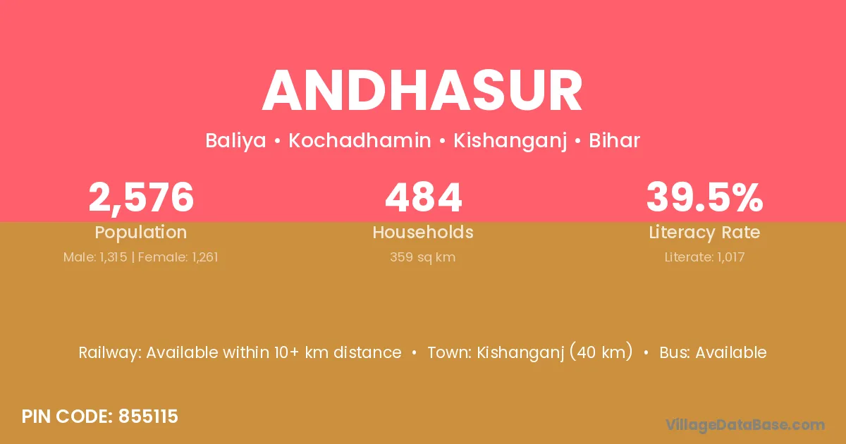 Kishanganj (40 km) is the nearest town to Andhasur village for major economic activities and is located approximately 40 km away.