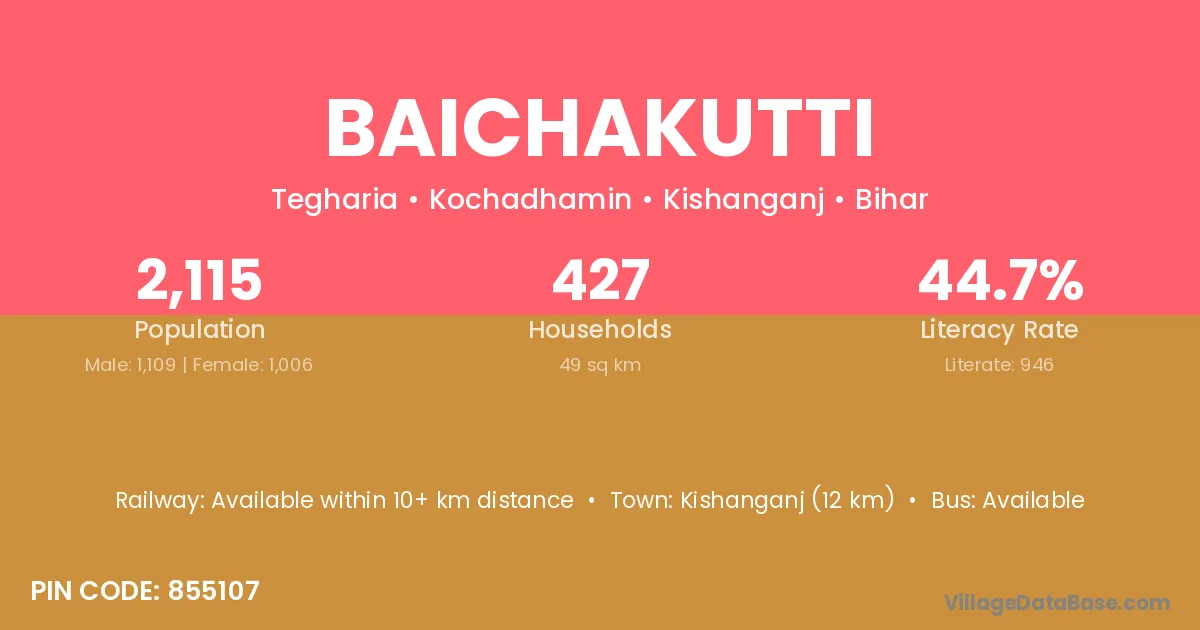 Kishanganj (12 km) is the nearest town to Baichakutti village for major economic activities and is located approximately 12 km away.