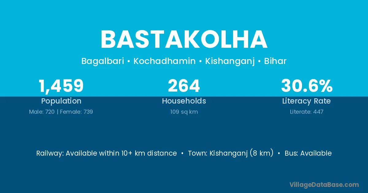 Kishanganj (8 km) is the nearest town to Bastakolha village for major economic activities and is located approximately 8 km away.