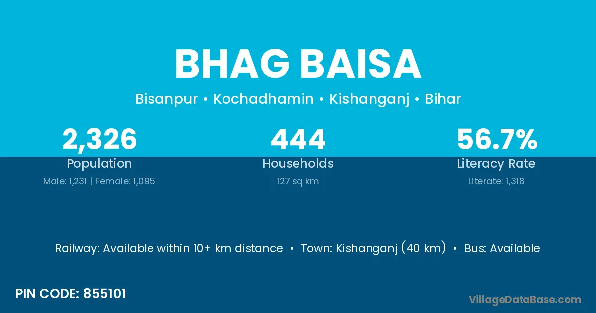 Kishanganj (40 km) is the nearest town to Bhag Baisa village for major economic activities and is located approximately 40 km away.