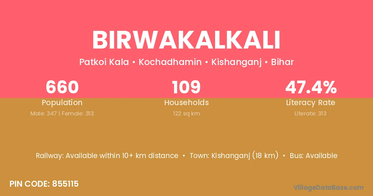 Kishanganj (18 km) is the nearest town to Birwakalkali village for major economic activities and is located approximately 18 km away.
