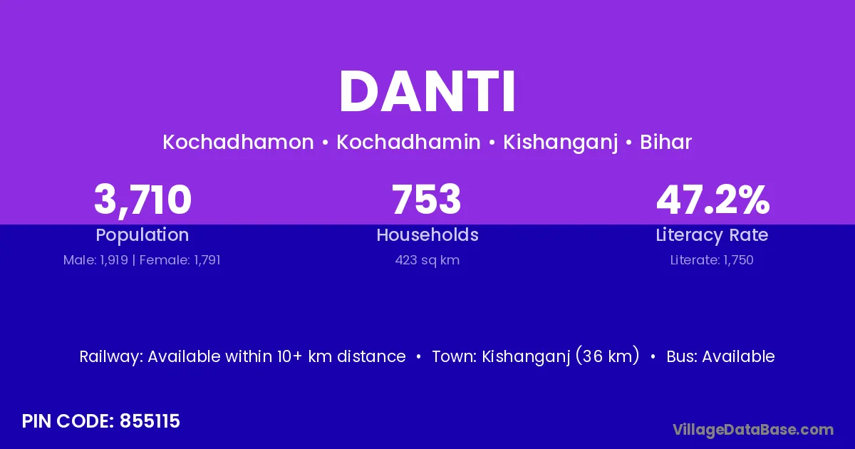 Kishanganj (36 km) is the nearest town to Danti village for major economic activities and is located approximately 36 km away.