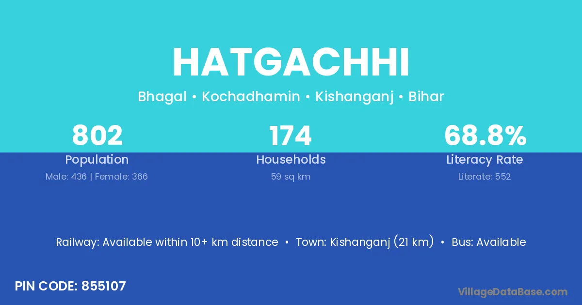 Kishanganj (21 km) is the nearest town to Hatgachhi village for major economic activities and is located approximately 21 km away.